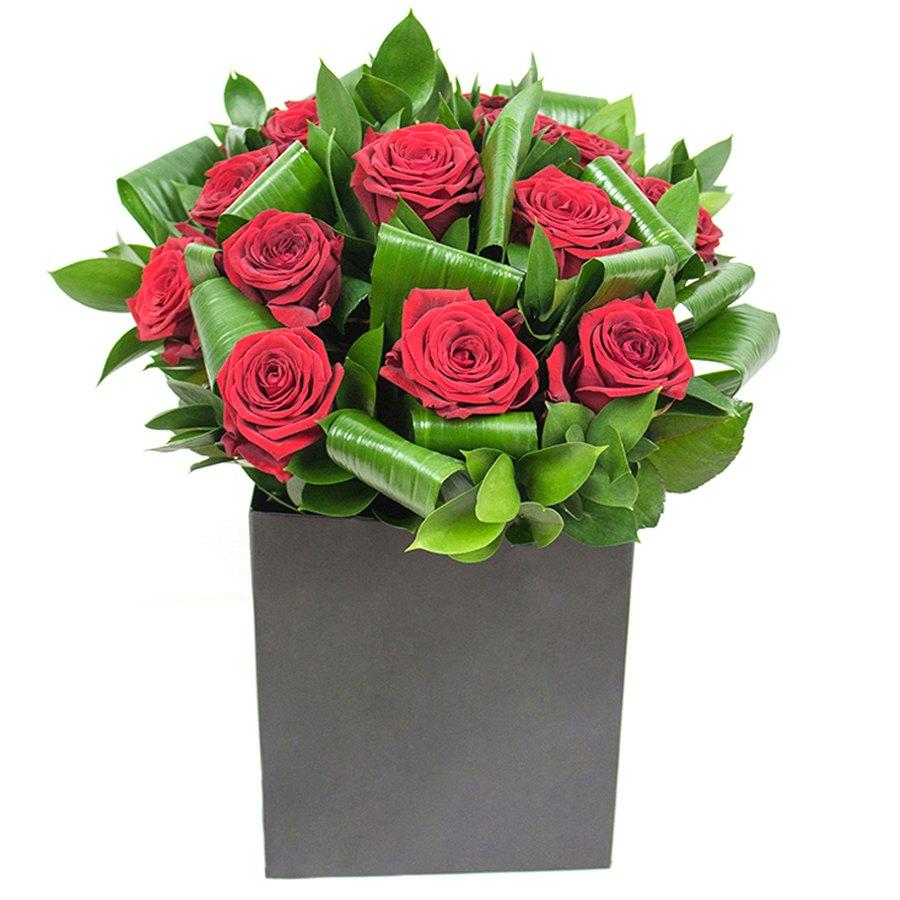 Transform any space with our bespoke arrangement of red roses, meticulously combined with aspidistra leaves and ruscus. Each flower is carefully curated to ensure an unforgettable presentation of purity and sophistication. Designed to express your deepest sentiments, this bouquet is perfect for any luxurious occasion.